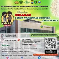Pelaksanaan Vaksinasi Booster ini diadakan mulai dari tanggal 21-23 April 2022 (Kamis s/d Sabtu) Pukul 08.30 WIB di Poli Vaksinasi RS. Bhayangkara Surabaya.