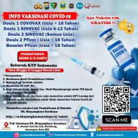 Pelayanan vaksin COVID-19 buka setiap hari Senin s/d Sabtu (hari Minggu & Tanggal Merah Libur) dan berlaku untuk seluruh KTP Indonesia. Vaksinasi Covid-19 yang tersedia seperti :