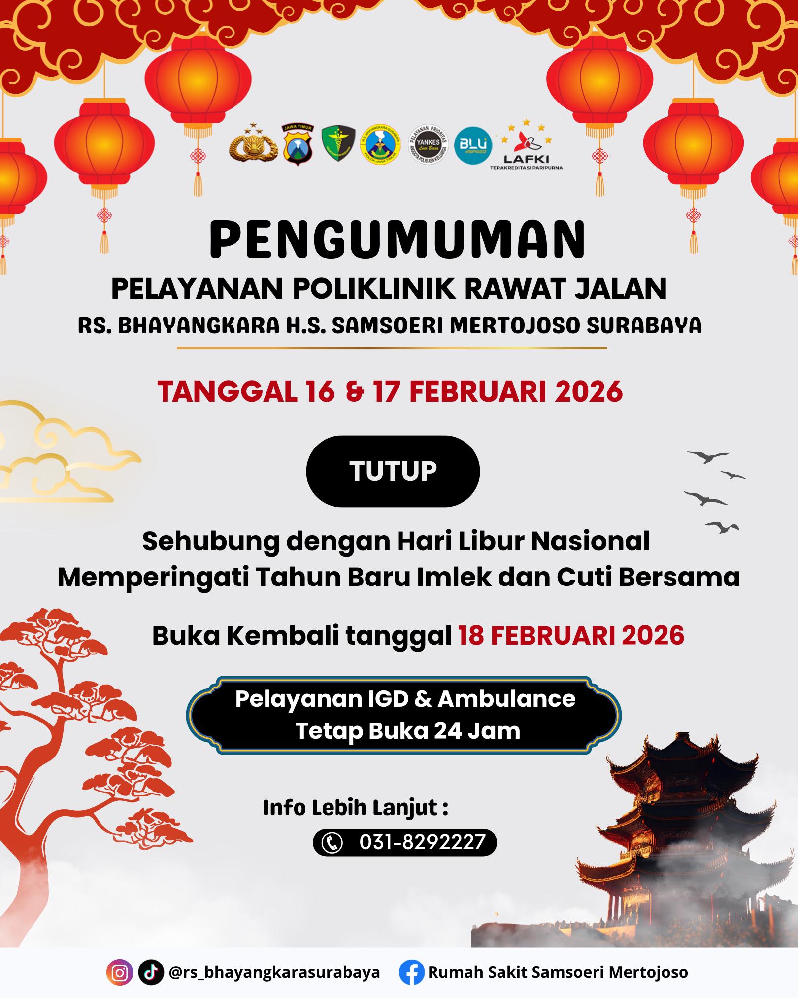 #RSBhayangkaraSurabaya #Pengumuman #InfoPelayanan #Imlek2026 #PelayananKesehatan