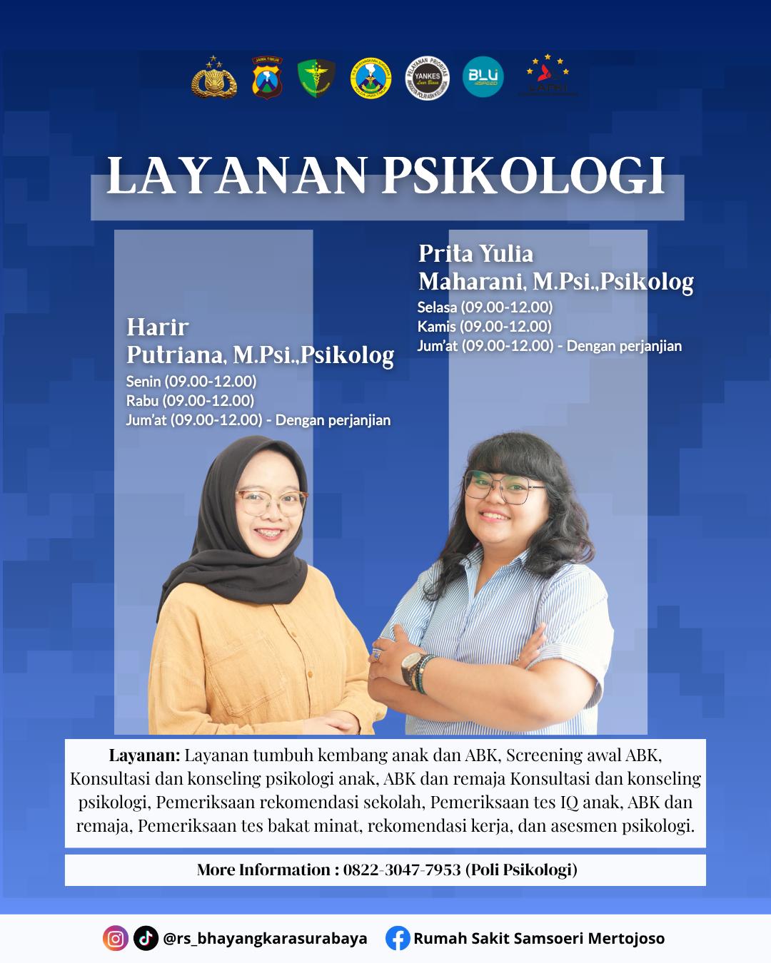 Layanan Psikologi RS Bhayangkara Surabaya hadir untuk mendampingi Anda dan keluarga, mulai dari konsultasi, konseling anak & remaja, hingga pemeriksaan psikologi.