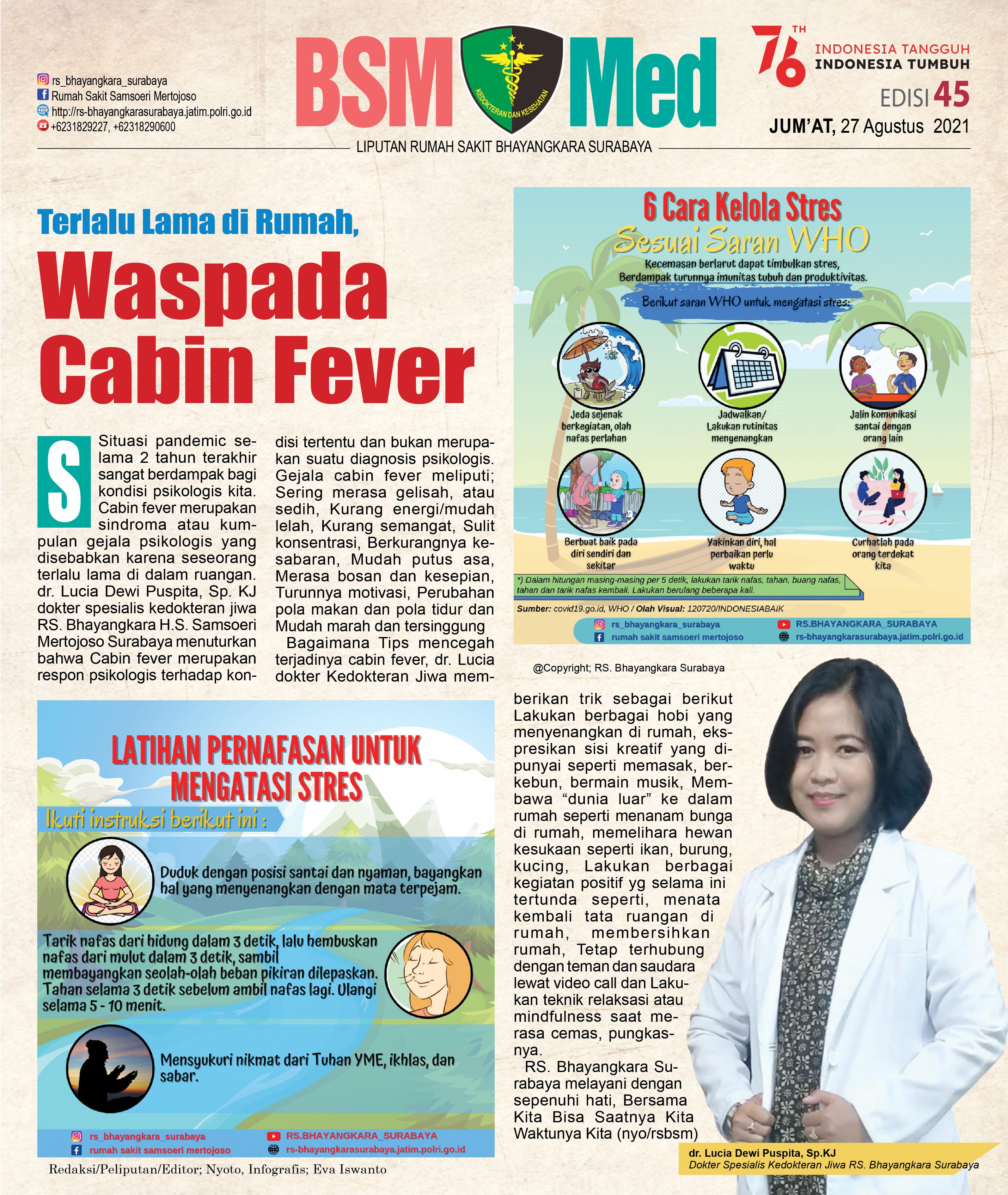 Situasi pandemic selama 2 tahun terakhir sangat berdampak bagi kondisi psikologis kita. Cabin fever merupakan sindroma atau kumpulan gejala psikologis yang disebabkan karena seseorang terlalu lama di dalam ruangan. dr. Lucia Dewi Puspita, Sp. KJ dokter spesialis kedokteran jiwa RS. Bhayangkara H.S. Samsoeri Mertojoso Surabaya menuturkan bahwa Cabin fever merupakan respon psikologis terhadap kondisi tertentu dan bukan merupakan suatu diagnosis psikologis. Gejala cabin fever meliputi; Sering merasa gelisah, atau sedih, Kurang energi/mudah lelah, Kurang semangat, Sulit konsentrasi, Berkurangnya kesabaran, Mudah putus asa, Merasa bosan dan kesepian, Turunnya motivasi, Perubahan pola makan dan pola tidur dan Mudah marah dan tersinggung.