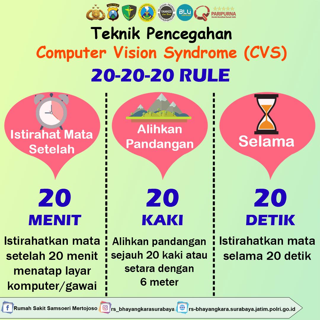 Computer Vision Sydrome (CVS) merupakan sekumpulan gejala pada mata dan leher yang disebabkan oleh penggunaan komputer/layar monitor yang berlebihan. Gejala ini biasanya meliputi nyeri pada leher dan mata. Computer Vision Syndrome (CVS) ini dapat dicegah dengan 20-20-20 Rule, sebagai berikut :