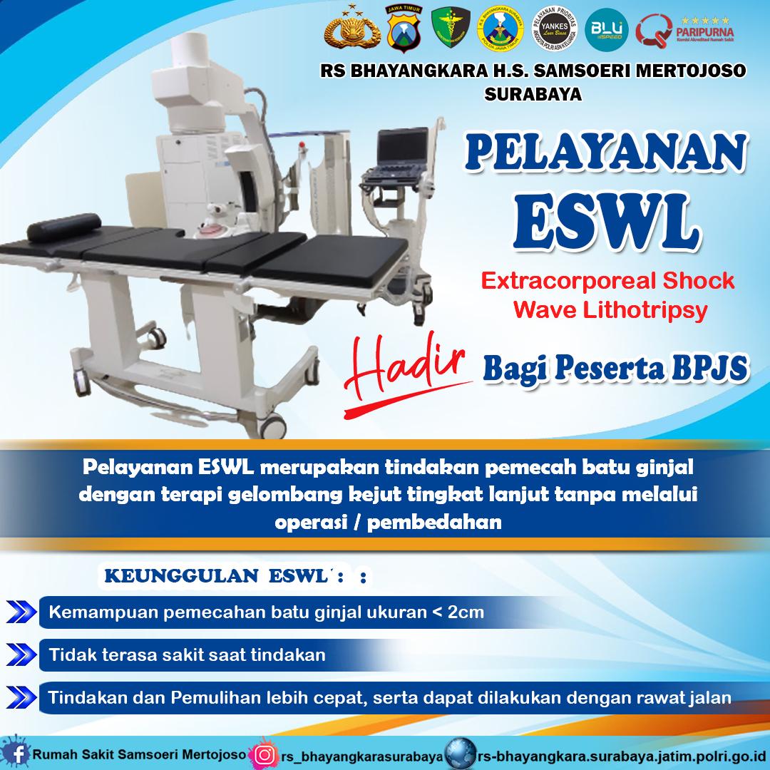 Hallo Sahabat RS. Bhayangkara Surabaya, saat ini Kami menghadirkan Pelayanan terbaru kami yaitu Pelayanan ESWL yang dapat digunakan bagi Peserta BPJS. Pelayanan ESWL ini merupakan tindakan pemecah batu ginjal dengan terapi gelombang kejut tingkat lanjut tanpa melalui Operasi / Pembedahan.