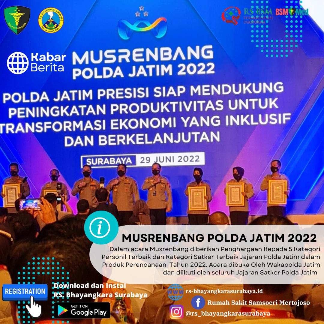 Plt. Karumkit Bhayangkara H.S Samsoeri Mertojoso Surabaya beserta Kasubbagrenmin dan Kaurren Subbagremmin Mengikuti Kegiatan Musrenbang Polda Jatim Tahun 2022 dengan Tema Polda Jatim Presisi siap Mendukung Peningkatan Produktivitas untuk Transformasi Ekonomi yang Inklusif dan Berkelanjutan. [nyo/rsbsm]